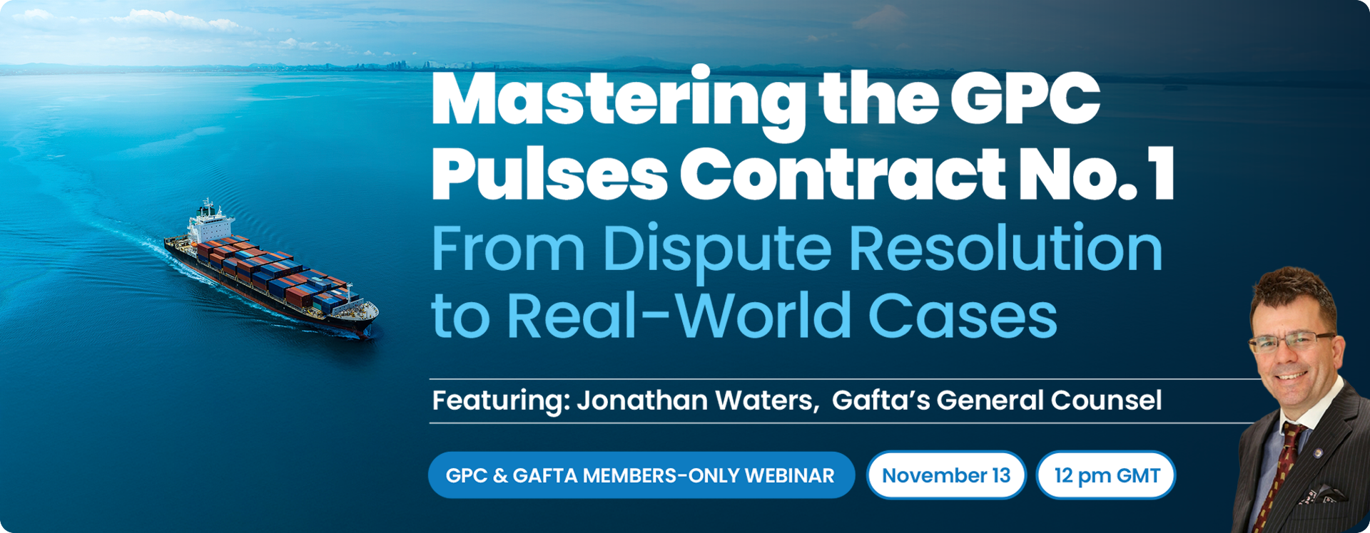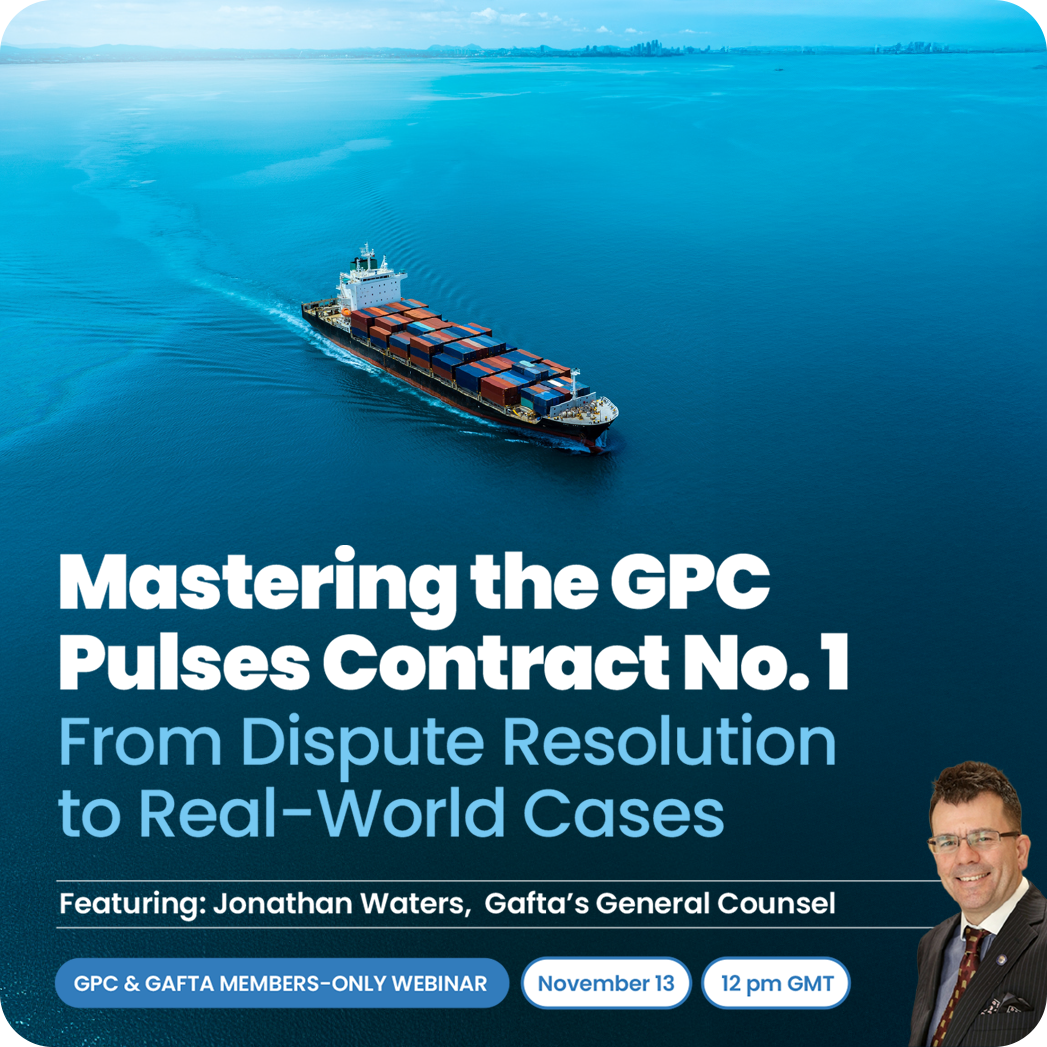 On November 13, at 12 pm GMT, join Jonathan Waters, Gafta’s General Counsel, for an exclusive GPC Webinar exploring key legal and practical considerations under GPC Contract No. 1. Get the latest updates on dispute resolution practices, contract enforcement, real trade cases, and more.